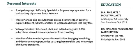 其次,使用具体的例子来展示你的兴趣特长。仅仅列出“摄影”或“旅行”可能不足以吸引雇主的注意。相反,你可以描述一次特别的旅行经历,或者提到你的摄影作品曾在某个展览中展出。这样的具体例子能够更好地展示你的热情和成就。
