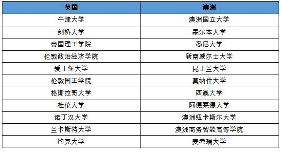 可申请的国外大学名单(部分)