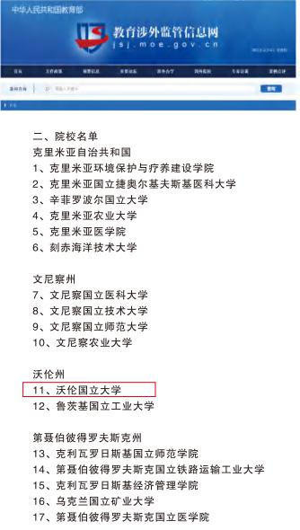 乌克兰沃伦国立大学为中国教育部涉外监管公示学校: