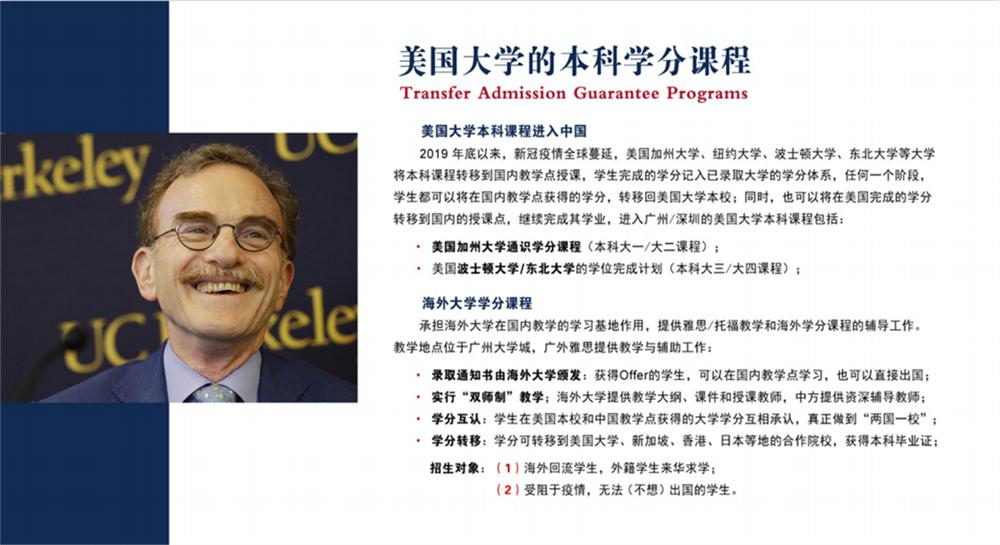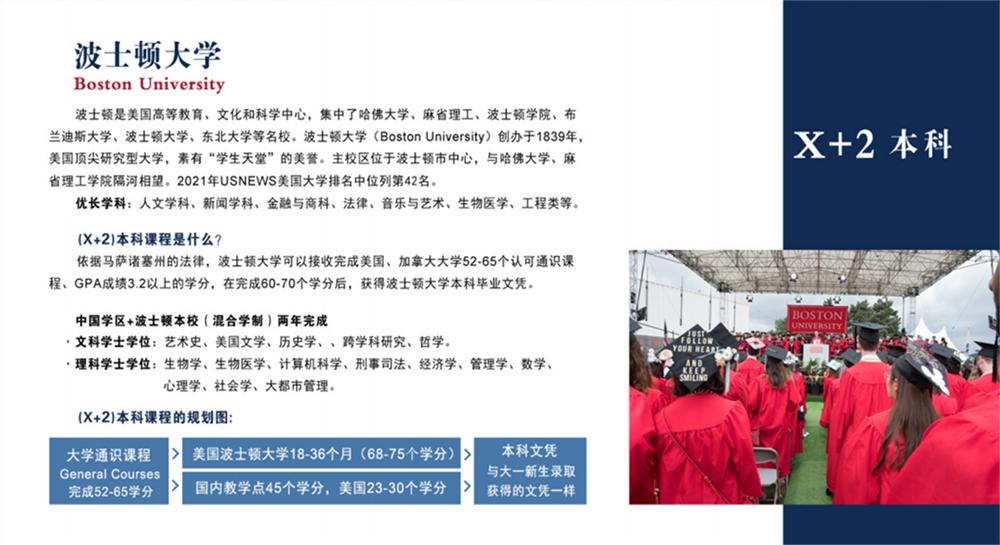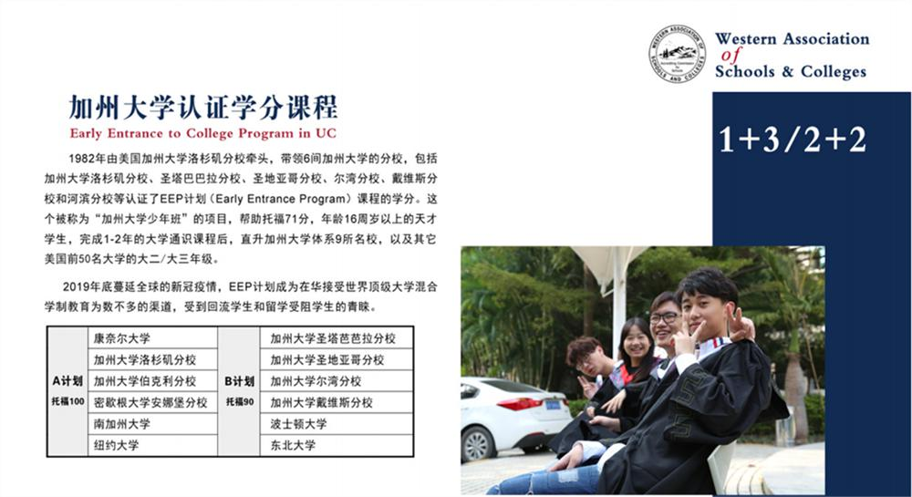 学生16岁以上即可入读我们的美国大学学分课程,学籍注册在美国加州或者华盛顿州,学籍双轨制管理:完成12个科目的学习后可获得美国公立高中的毕业证书,同时获得大学录取直升大二或者大三。学生从我们这里获得的美国大学学分被全球绝大部分顶 尖大学认可,成绩优 秀的学生可转学去美国、加拿大、新加坡、日本、香港等主流留学地区的世界名 校。我们有A、B、C三种培养计划:A计划主要是瞄准世界前三十的名 校,要求绩点3.8以上、托福100分左右;即使是进入C计划的学生也可以被波士顿大学这个级别的大学录取。留学选择灵活多样,1+3/2+2/3+1模式均可。