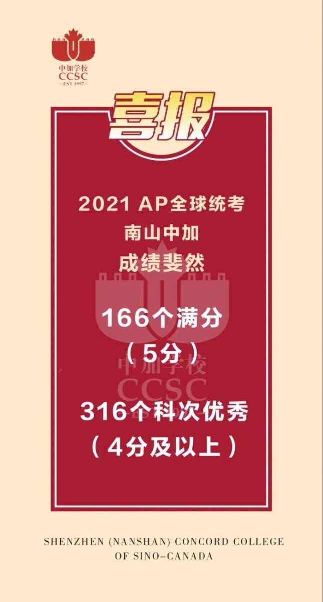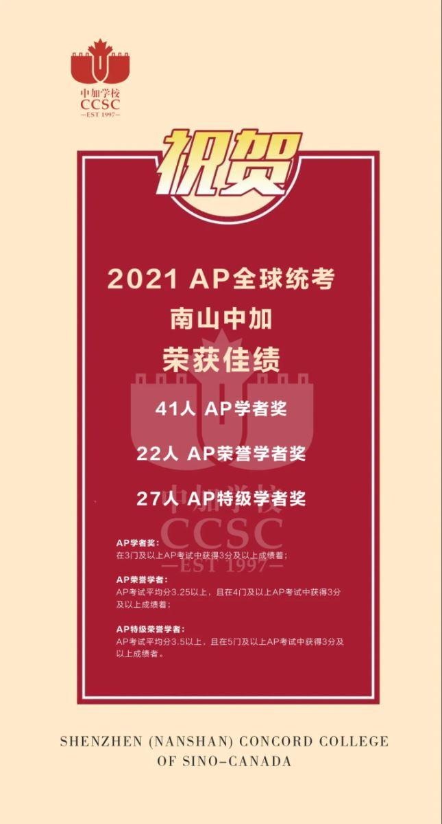 因在AP领域取得的卓越成绩和杰出贡献,2019年7月,加皇国际教育集团(南山中加学校所属教育集团)受邀参加AP Annual Conference in Orlando(AP年会,在美国奥兰多举行),这也是此次年会中,一个美国以外的AP外国社区中心代表。2021年5月,在全球大学线上巡展活动中,南山中加再次受邀进行AP经验分享。此举也标志着中加学校在AP课程研发、教学交流、师资培养、考试资讯和数据上,已成为AP行业的品牌。