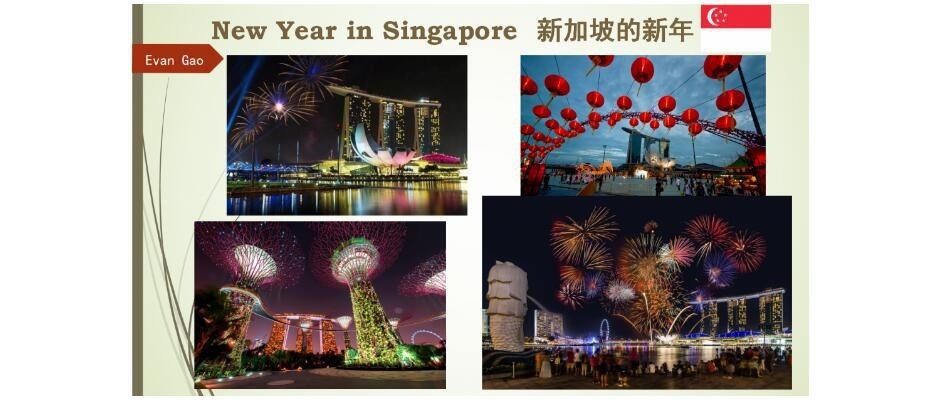 大家好,我是六年级的Evan Gao,今天我要演讲的主题是新加坡人是如何庆祝除夕节的。 在每年的除夕夜,政府会在滨海湾旁举行烟花秀的庆祝活动。同时,滨海湾的花车表演也是当晚的活动焦点,在售票看台和附近的建筑物将一览整场表演秀。在迎接2019年和2020年跨年夜中,烟花秀都是由星岛--爱维克斯集团旗下的制作公司制作完成的,表演秀将烟花与大型灯光秀等元素结合在一起,其中在2020年中,还有包括无人机的表演。广播公司MediaCorp也会在The Promontory举办新年音乐会,规模较小的地方性庆祝活动则在市中心举行。新加坡人对这样的庆祝活动赞不绝口,在2020年度庆祝活动期间,《海峡时报》采访了35岁的马来西亚游客Mary Chen女士,她赞叹道:"无人机表演太神奇了,我们喜欢这样的表演和故事情节。" 而55岁的兼职家教Gary Fong对Avex的活动大加赞赏:"来自日本的烟花秀太有活力了,色彩也更丰富,比一般的烟花表演好看多了。"