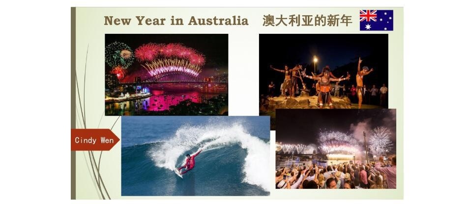 大家好,我是六年级的Cindy Wen,我为大家介绍澳大利亚是如何欢度新年的。对于火热奔放的澳洲人来说,一月是一个举国狂欢的月份,除了迎接新年,人们还要举行各种丰富的国庆活动,因为一月二十六日是澳大利亚国庆日。在城市悉尼,神秘火辣的土著歌舞典礼吹响狂欢的号角,舞者都穿着原始的装扮,男子全部白泥抹身,两眼周边涂以轮环,用树枝缚于足裸,腰间围着一小块兽皮。女子穿着飘逸的长袍,披散着头发。澳大利亚人一直非常尊重土著部落的文化和传统,特意把这个庆典作为重要节日的开幕式,规模宏大,汇聚国内最有名的表演者。此外,声势浩大的千人冲浪比赛也挑动着人们的心弦,盛大的汽车展和美味烧烤大会更是让人一饱眼福和口福。推崇创意的澳大利亚人会自制各种各样的国庆装,穿在身上,戴在头上,成为悉尼街头一道独特的风景线。