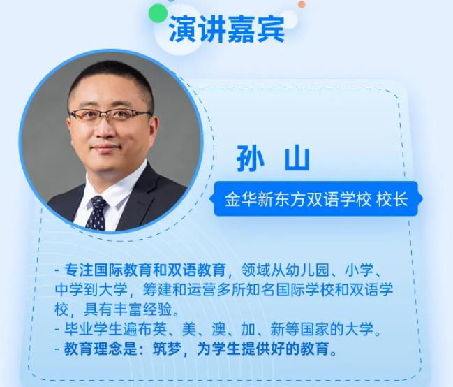 届时,金华市新东方双语学校孙山校长将现场演讲,为各位学生和家长分享如何从小培养孩子核心竞争力,以及如何帮助孩子跨越“升学”这道坎。同时,也将全面介绍学校的办学背景、入学情况等。这么好的机会,还不赶快抓紧?