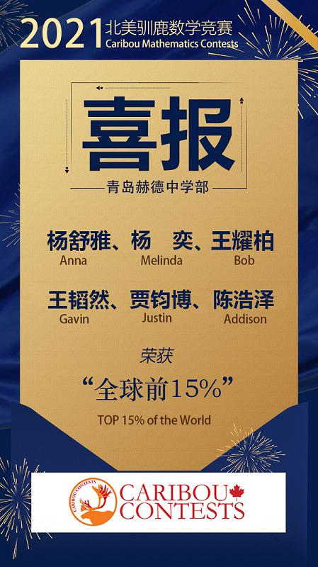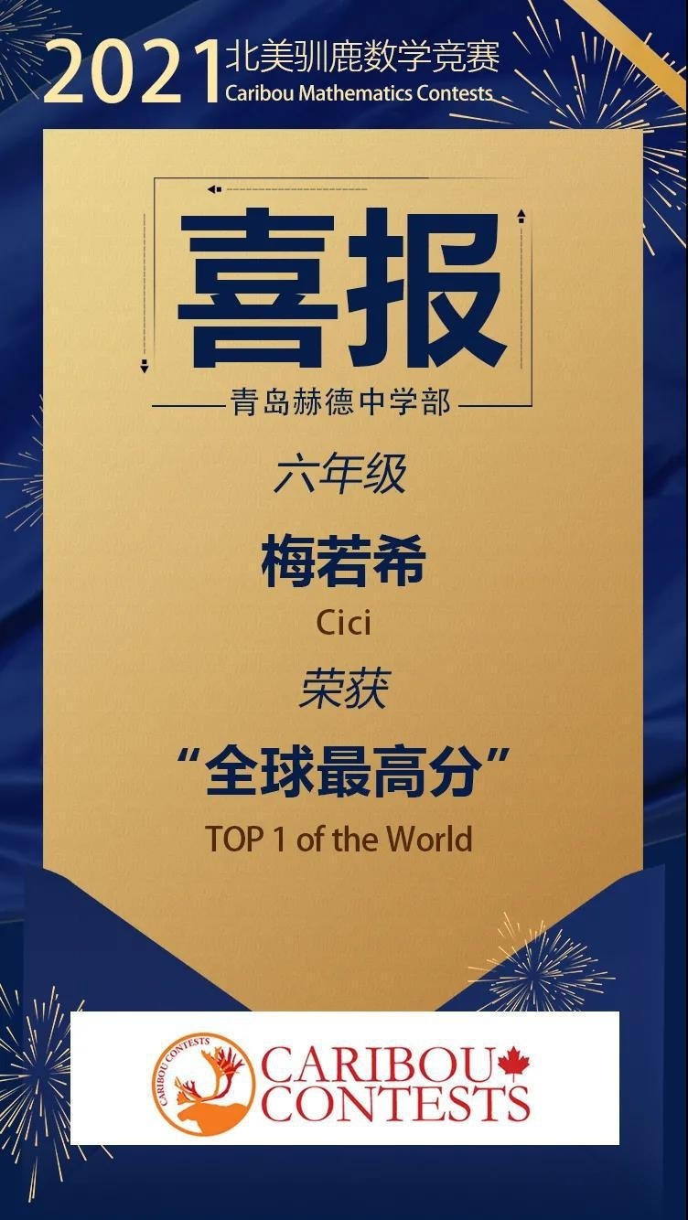 近日,青岛赫德中学部再创佳绩!在刚刚结束的北美驯鹿数学竞赛中,青岛赫德中学部的Cici同学获得了同年级段全球名的好成绩。同时,青岛赫德中学部的7名同学进入了全球排名前15%。这是继斩获全美经济学挑战赛大奖、世界学者杯大赛等一系列国际赛事之后,赫德学子再次取得的傲人成绩!