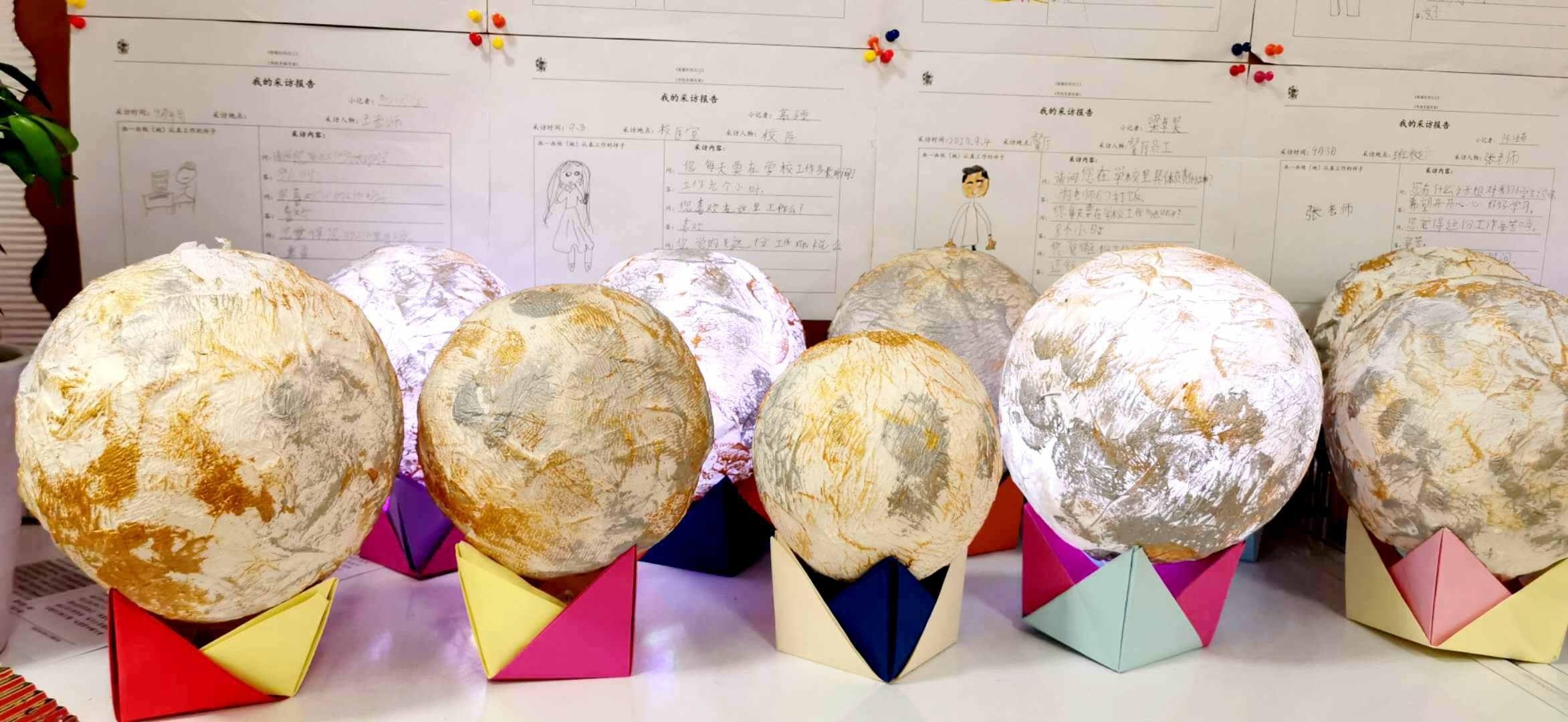 除了月饼包装盒,同学们还制作了手工灯笼、月球灯等,同时,学习了灯谜文化,进行猜灯谜活动,趣味和知识并存。