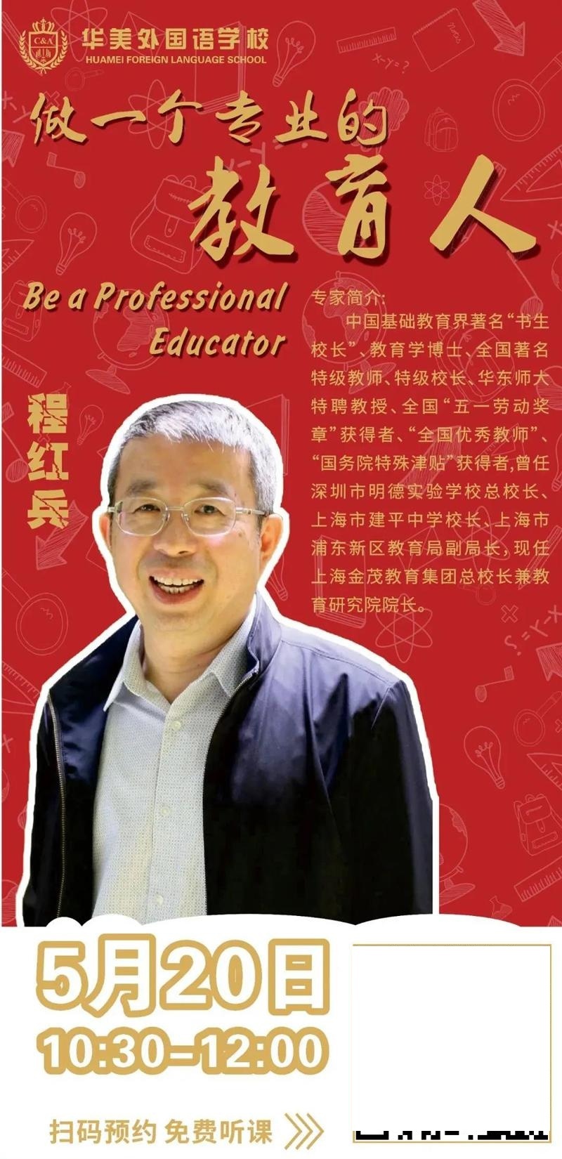 为深入推进教育改革,建设现代学校治理体系,构建教师幸福成长体系,建设文明优雅、高雅、高贵、高尚、高素质的现代新型教师团队,5月20日,华美外国语学校诚邀中国基础教育界著名“书生校长”、教育学博士、全国著名特级教师、特级校长、华东师大特聘教授程红兵先生莅临学校,特为全体教育工作者开办一场题为《做一个专业的教育人》的现代教育专题讲座。