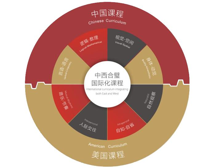 学校构建了IB理念下的中西融合课程,由具有丰富IB教学经验的中外教师实施中外融合课程教学,开设丰富的CAS活动课程,注重培养学生面向世界、面向未来的创新能力与综合素养。国家课程由国内学科带头人、骨干教师及优秀外籍教师执教,注重基础知识和基本技能,开设丰富多彩的社团活动,在坚守国家课程的基础上,融合国际课程优质元素,达到中西双语融合教学的理想目标。小学部融合IBPYP课程的优质元素;初中部融合IBMYP课程的优质元素;国际高中开设A-Level,Keystone,IFD,DSE等不同类型的课程。