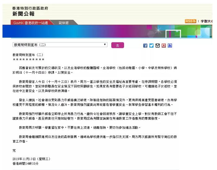 鉴于香港目前的特殊状况,11月13日香港教育局发出紧急公告:全港学校(包括幼儿园、小学、中学及特殊学校)将于14日停课,以策安全。